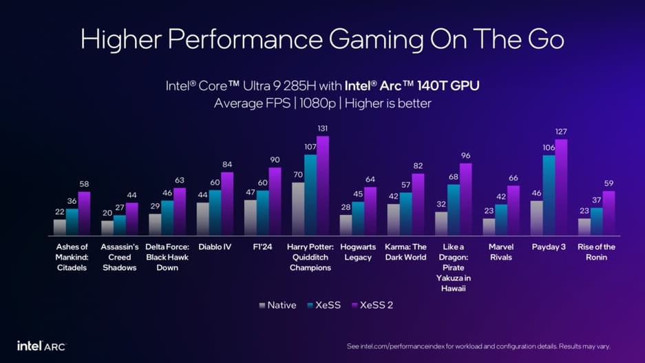 Важное преимущество XeSS 2 — поддержка не только дискретных видеокарт, но и процессоров Intel Core Ultra с встроенной графикой Arc. Это делает возможным запуск современных игр на ноутбуках и портативных устройствах. Например, с чипом Core Ultra 9 285H игры, едва работавшие на 30 fps, теперь идут на 60+ fps при Full HD.