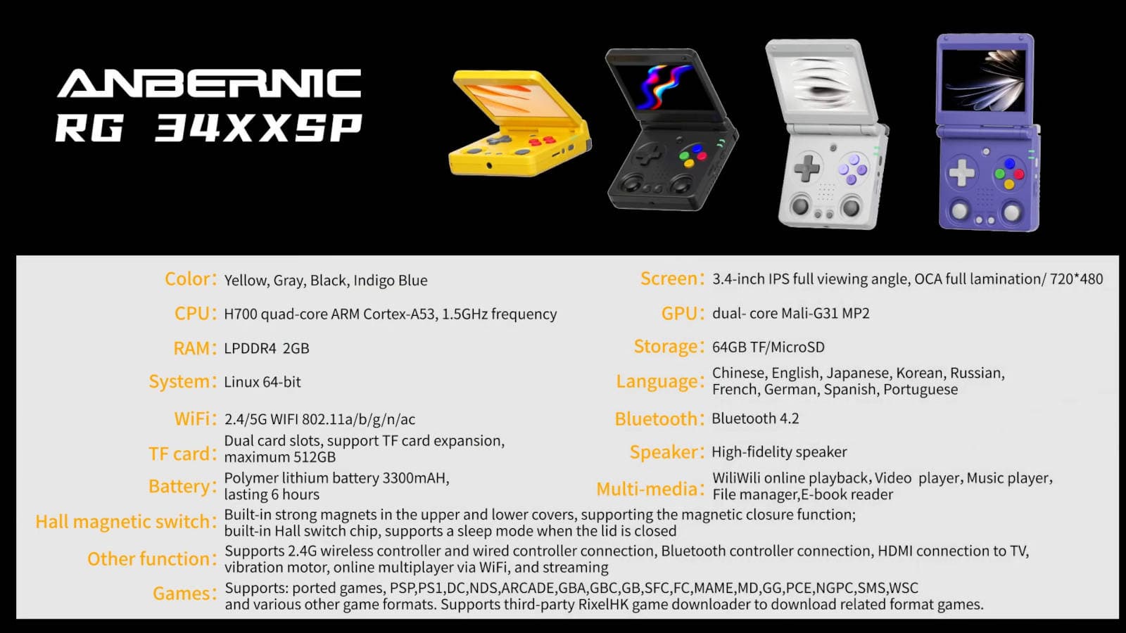 Компания Anbernic опубликовала новый промо-ролик портативной и раскладной ретро-консоли RG34XXSP, а также представила характеристики этого устройства, получившего четыре вариации раскраски (желтый, серый, черный и синий индиго, напоминающий фиолетовый).