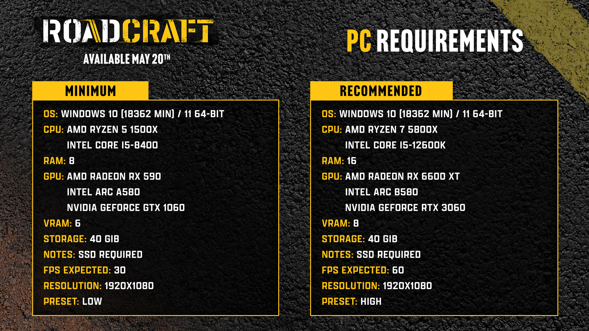 Рекомендованные системные требования RoadCraft (ожидается 60 FPS при 1080p и высоких настройках графики):
