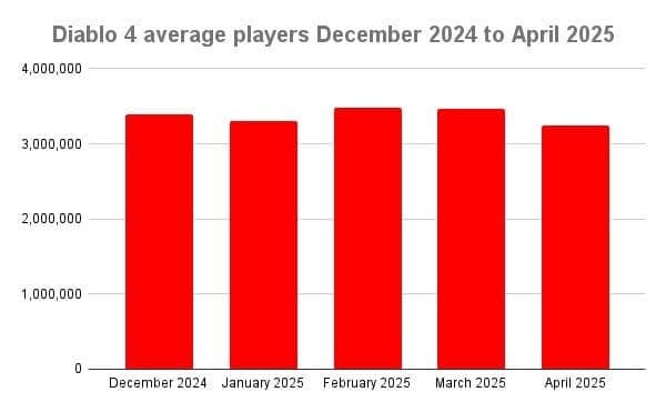 Согласно данным трекера Active Player, в апреле среднесуточная аудитория Diablo 4 составила около 3,2 млн игроков. Это на 200 тысяч меньше, чем в марте, когда цифра превышала 3,4 млн. Пик пришёлся на февраль — тогда игру запускали чаще всего. Январь показал умеренное снижение, но именно апрель стал самым слабым месяцем с декабря.