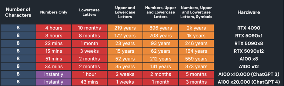 Для сравнения, одна RTX 4090 взламывает пароль из цифр за 4 часа, а максимально сложный за две тысячи лет.