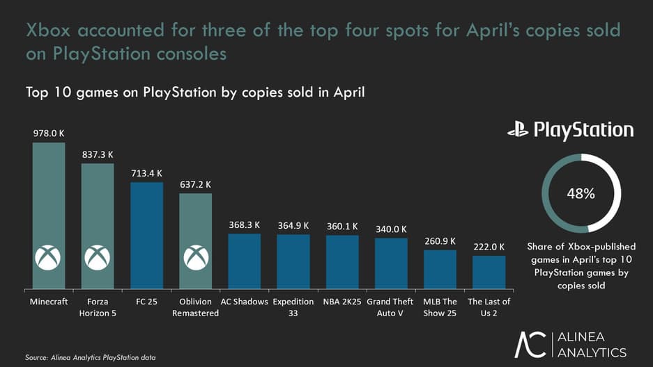 Согласно данным, в топ-5 продаж апреля на PS приходится 69% копий проектов Xbox. Общая доля Xbox-игр в топ-10 продаж PlayStation составляет 48%. У самой Sony туда попали только два проекта — The Last of Us Part II и MLB.