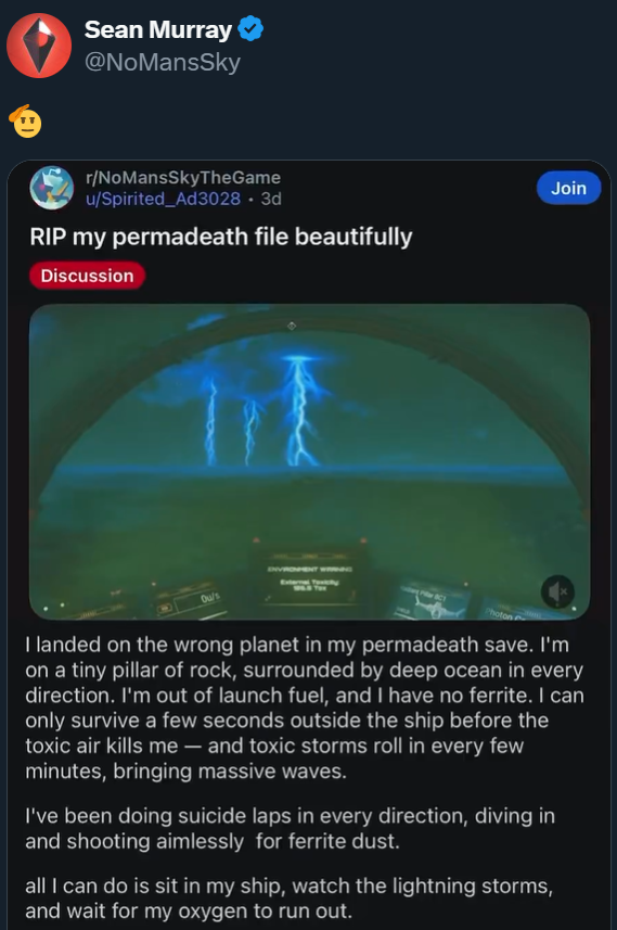Недавно история Spirited_Ad3028 привлекла внимание босса Hello Games Шона Мюррея. Геймер играл в режиме с перманентной смертью и совершил роковую ошибку при выборе остановки.