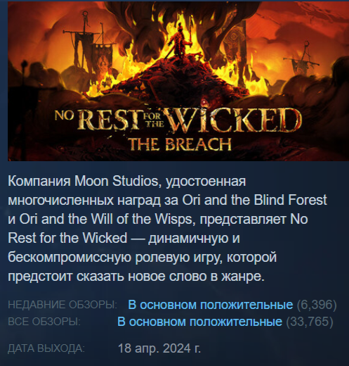 В результате у No Rest for the Wicked обвалился рейтинг. Хотя разработчики и стали постепенно исправлять игру, рейтинг в Steam долгое время оставался в «красной зоне» (недавние обзоры были «в основном отрицательные»).