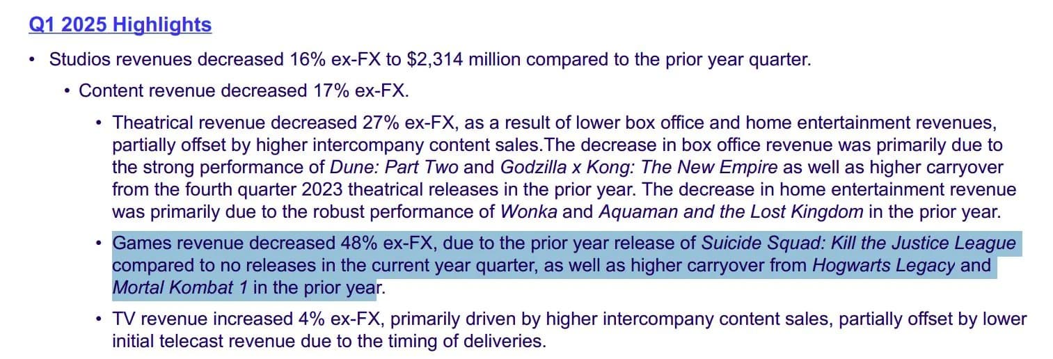 Warner Bros Games отчиталась о падении доходов на 48% в первом квартале 2025 года. Компания снова обвинила провалившуюся Suicide Squad: Kill the Justice League и отсутствие крупных релизов.