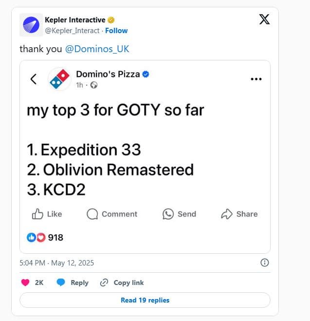 Domino's (ее британское подразделение, если быть более точными) снова пытается быть на одной волне с игровым сообществом. На этот раз пиццерия представила список из трех лучших игр 2025 года, который возглавила Clair Obscur: Expedition 33. На втором месте расположился ремастер Oblivion, а замкнула тройку Kingdom Come 2.