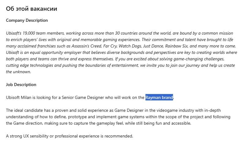 Ubisoft Milan подтвердила разработку нового проекта в серии Rayman. Об этом стало известно благодаря вакансии на LinkedIn, в которой компания ищет старшего геймдизайнера для команды, работающей над платформером.