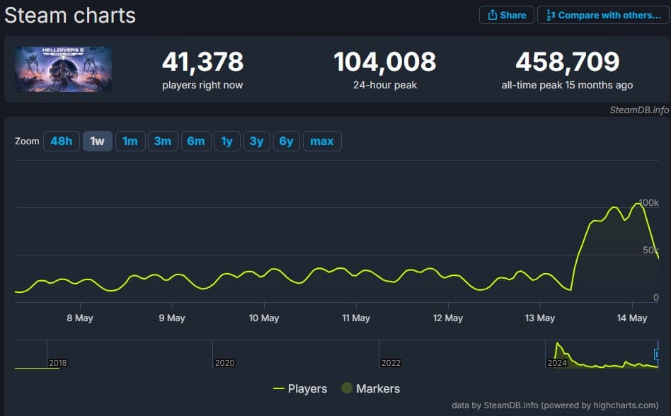 Helldivers 2 вернулась в топы Steam благодаря крупному обновлению от Arrowhead. За сутки онлайн вырос вчетверо — с 25 до 100 тысяч игроков. Это лучший результат за последние месяцы.