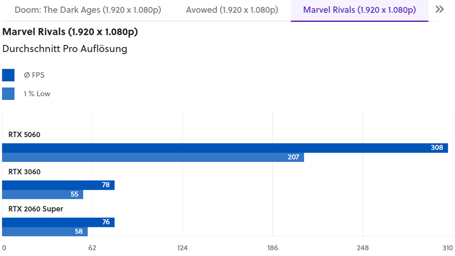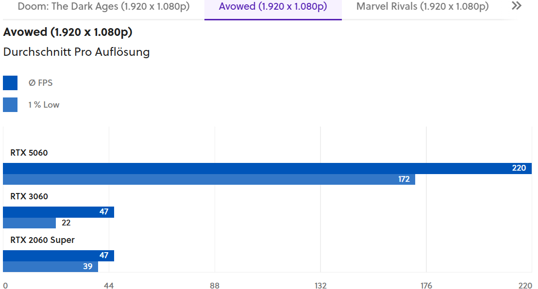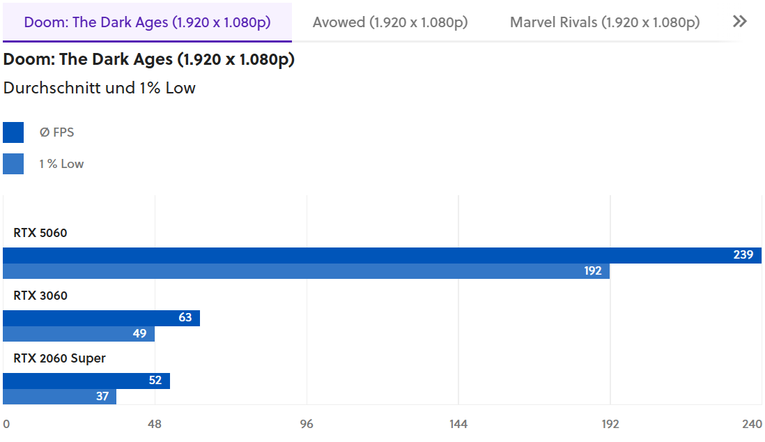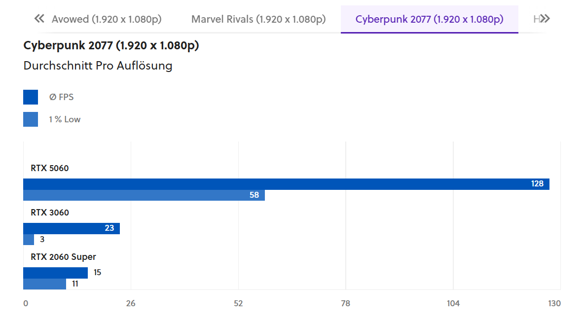 - Тесты GeForce RTX 5060 позволили проводить лишь в пяти играх: Avowed, DOOM The Dark Ages, Marvel Rivals, Cyberpunk 2077 и Hogwarts Legacy.