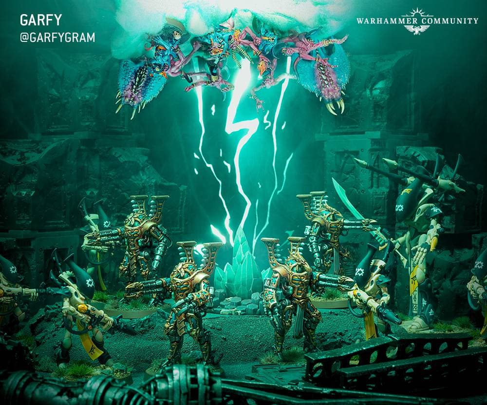 Благодаря сообществу фанатов настольной игры Warhammer 40,000, где можно отыскать множество художников, и сотрудникам компании Games Workshop, у людей сегодня получилось изучить фотографии, на которых представлены диорамы с новыми роботами Сехетар из набора Warpflame Thrallband Battleforce.
