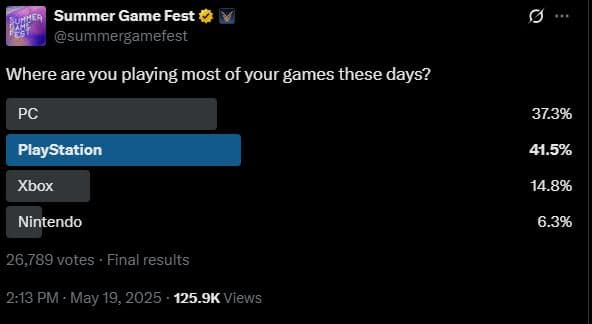 Согласно опросу, организованному страницей Summer Game Fest в социальной сети X, большинство геймеров отдают предпочтение игровым консолям PlayStation, а не другим платформам, включая Xbox и ПК. Опрос, проведенный среди игроков, показал, что 41,5% респондентов выбирают PlayStation как свою любимую игровую платформу, в то время как Xbox предпочитают 14,8%, а ПК — 37,3%. Nintendo выбрали всего 6,3% людей.