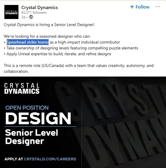 Сейчас команда ищет старшего дизайнера уровней для участия в так называемой Strike Team. Такие группы формируются на финишной прямой — для устранения багов, улучшения производительности и подготовки проекта к релизу или показу.