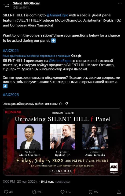 Konami проведёт специальную презентацию Silent Hill f на фестивале Anime Expo. Компания пригласила фанатов на панель с участием продюсера Мотои Окамото, сценариста Ryukishi07 и композитора Акиры Ямаоки.