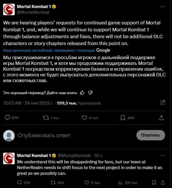 NetherRealm подтвердила: новых бойцов и сюжетных DLC не будет. Но игра не останется без внимания — разработчики продолжат выпускать патчи с исправлениями багов и настройками баланса. Поддержка закончится постепенно, без резкого обрыва.
