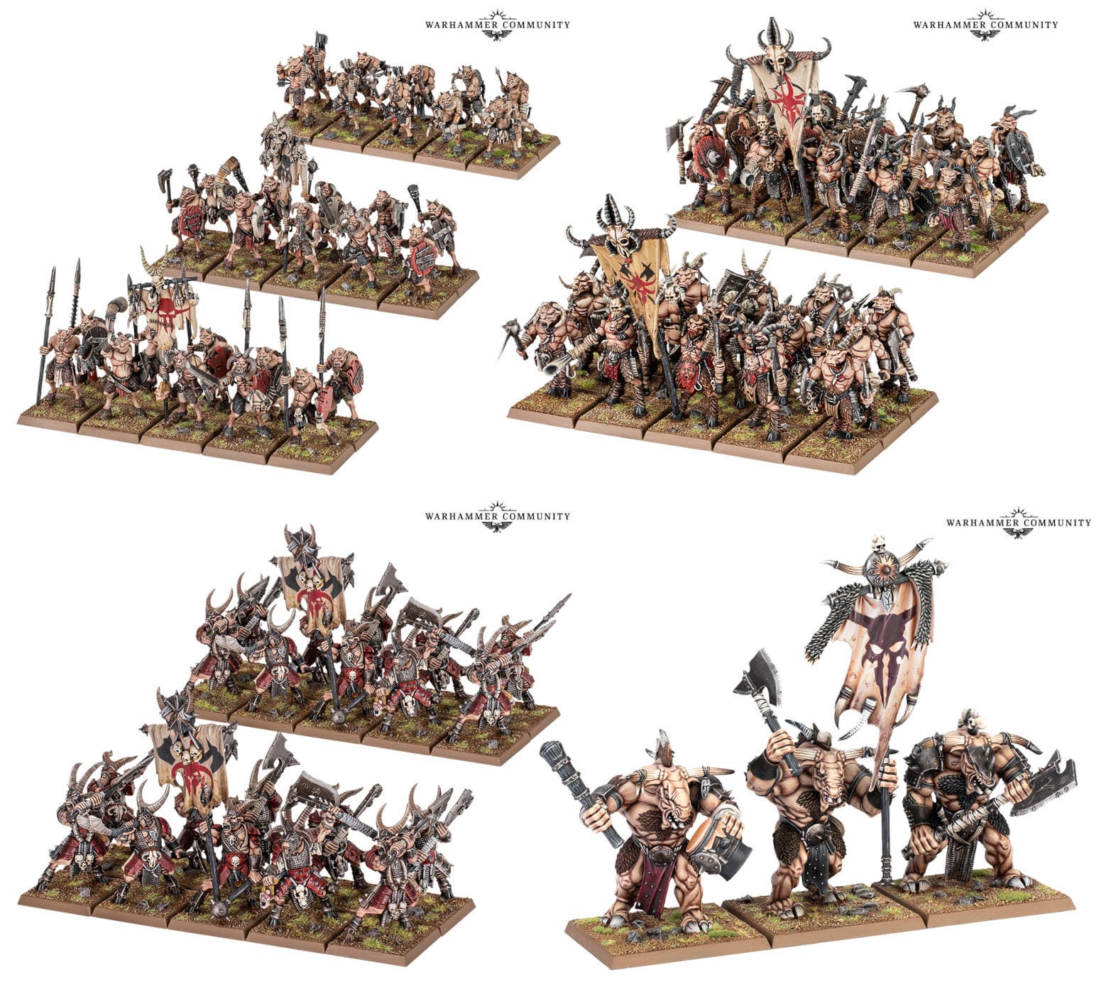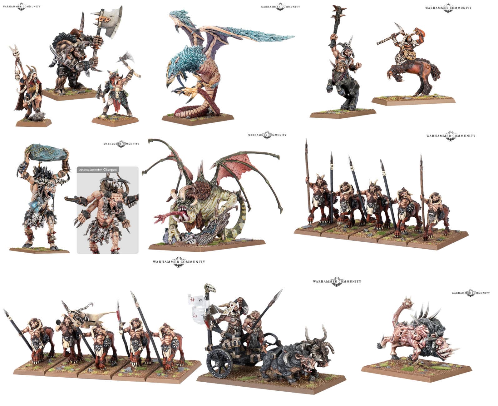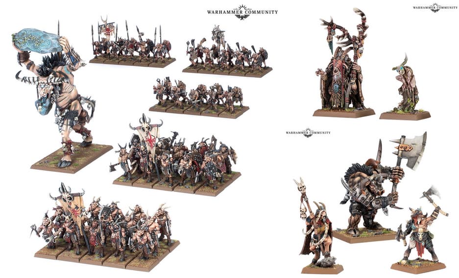 Можно будет приобрести коробку Beastmen Brayherds Battalion с 61 миниатюрами – 30 унгорами, 30 горами и Цигором (или Горгоном). Также вернутся следующие миниатюры: пластик – главарь, шаман, унгоры, горы, бестигоры, минотавры, горгон и кигор, смола – провидец Кралмав, главарь минотавров, прейтон, бармазмей, куролиск, металл – штандартоносец, главари центигоров, мутант-кабан, Гхоррос Боевое Копыто