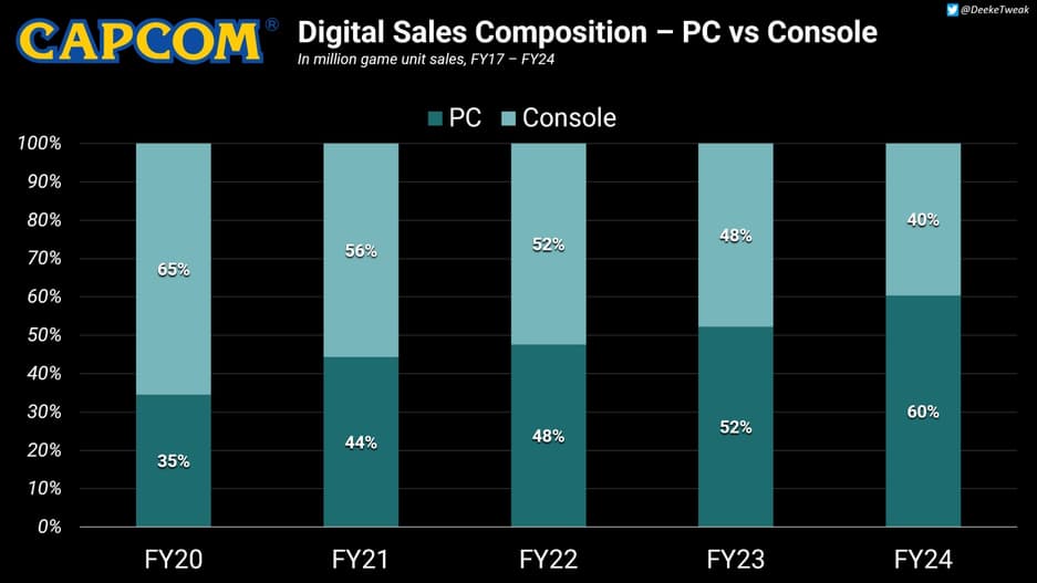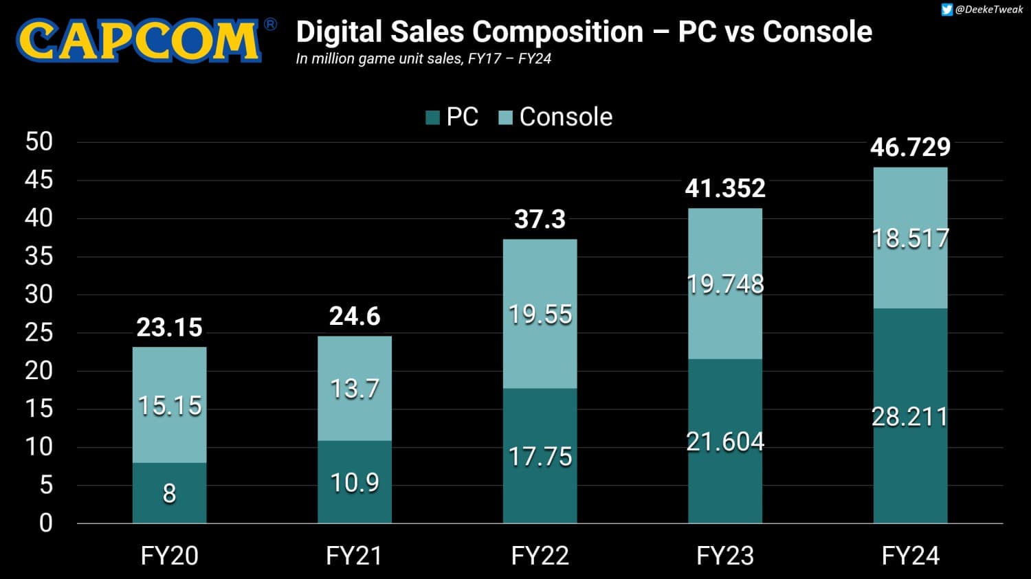 Capcom отчитался о финансовых результатах за прошлый год и подтвердил: ПК стал главной платформой для цифровой продажи игр компании. Из 51 миллиона копий, проданных за год, 28,2 миллиона пришлись на ПК — это 60% всей цифровой дистрибуции.