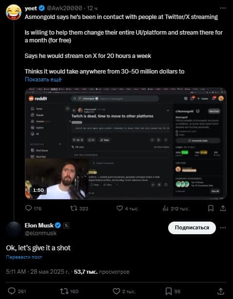 Спустя несколько часов после выхода клипа с заявлением стримера, на его слова отреагировал Илон Маск: «Ок, давай попробуем», — написал он в X.