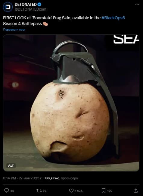 В четвёртом сезоне Call of Duty: Black Ops 6 в боевом пропуске появился неожиданный предмет — граната в виде картошки. Скин с говорящим названием Boomtato (Boom+Potato)— декоративный вариант осколочной гранаты, стилизованный под клубень.