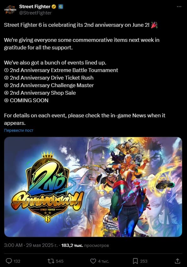 Capcom объявила о начале празднования второй годовщины релиза Street Fighter 6. Старт торжеств запланирован на 2 июня, и в рамках ивента игроки получат бесплатные подарки и смогут принять участие в различных игровых событиях.