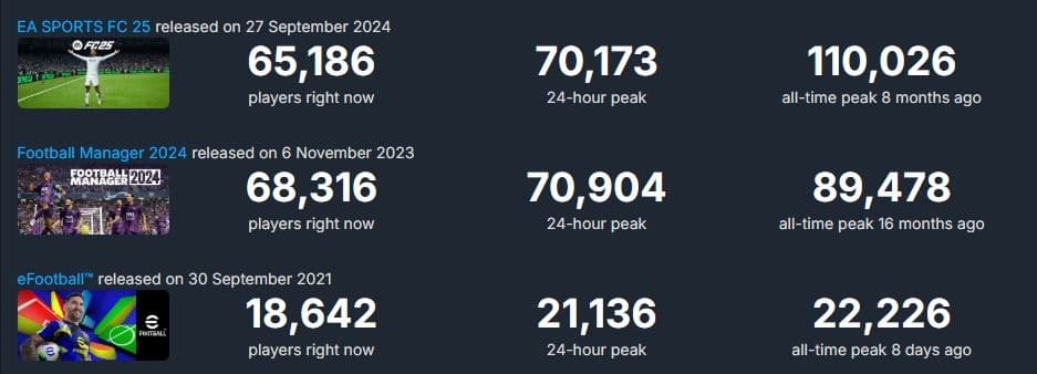 Хотя релиз намечен на 19 июня 2025 года на ПК, PlayStation 5 и Xbox Series X|S, уже сейчас Rematch показывает лучшие результаты, чем устоявшиеся проекты вроде EA Sports FC, Football Manager 2024 и eFootball. Пиковый онлайн за последние сутки составил 155 637 игроков. И это при том, что проект всё ещё на стадии тестирования.