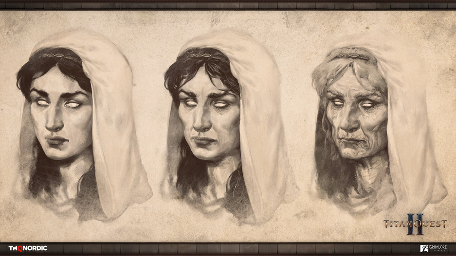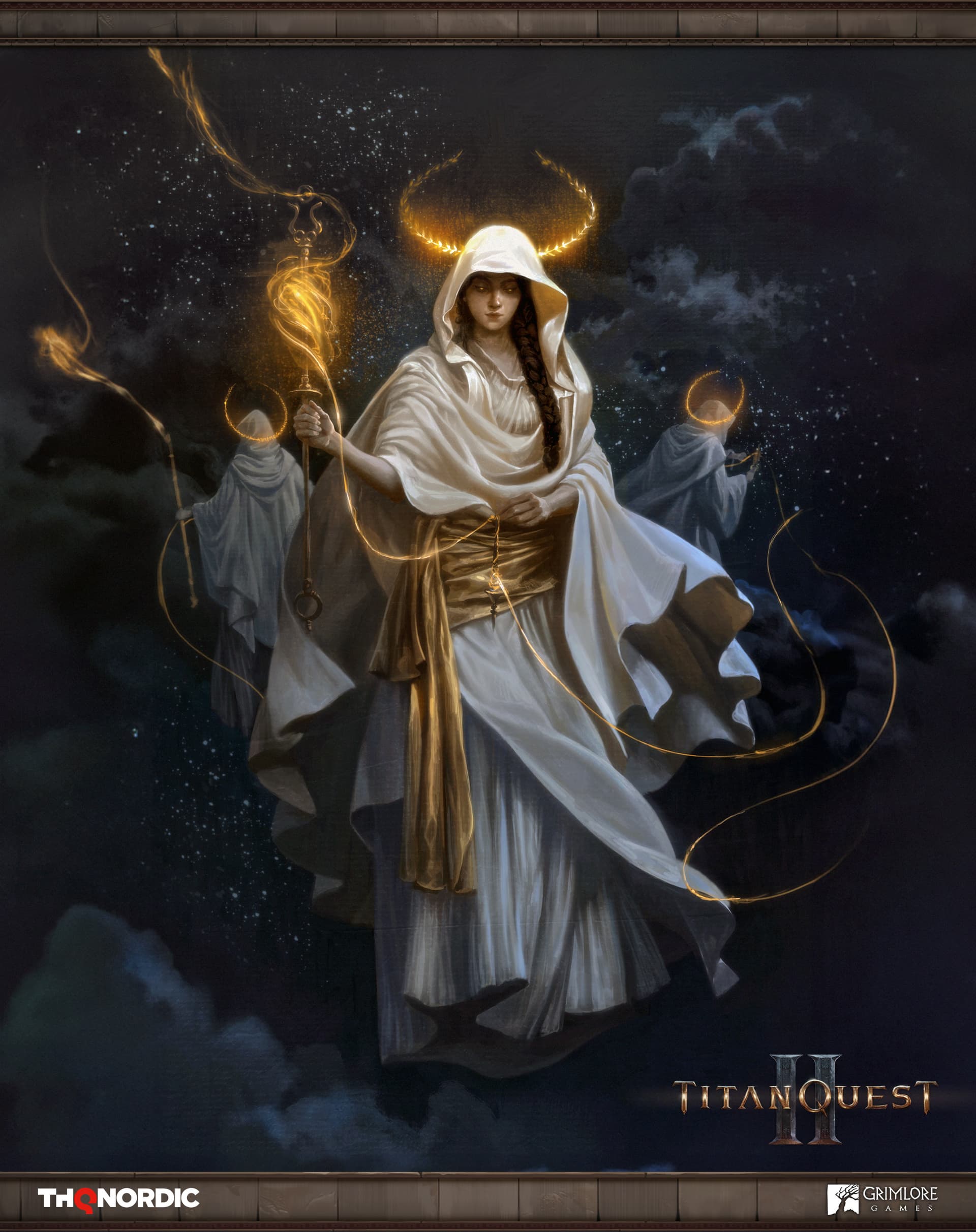 Первая из Мойр - Клото, "Прядильщица", которая с помощью своего веретена ткет нить жизни смертных и определяет час их рождения. Затем идет Лахесис, "Распределительница", которая с помощью своего измерительного жезла определяет продолжительность жизни смертного и то, как она будет прожита. И, наконец, Атропос, "Та, кого нельзя повернуть", которая обрывает нити жизни, когда они заканчиваются. В Titan Quest 2 три Мойры — это три аспекта одного существа, имеющие одно лицо, но находящиеся на разных этапах жизни».