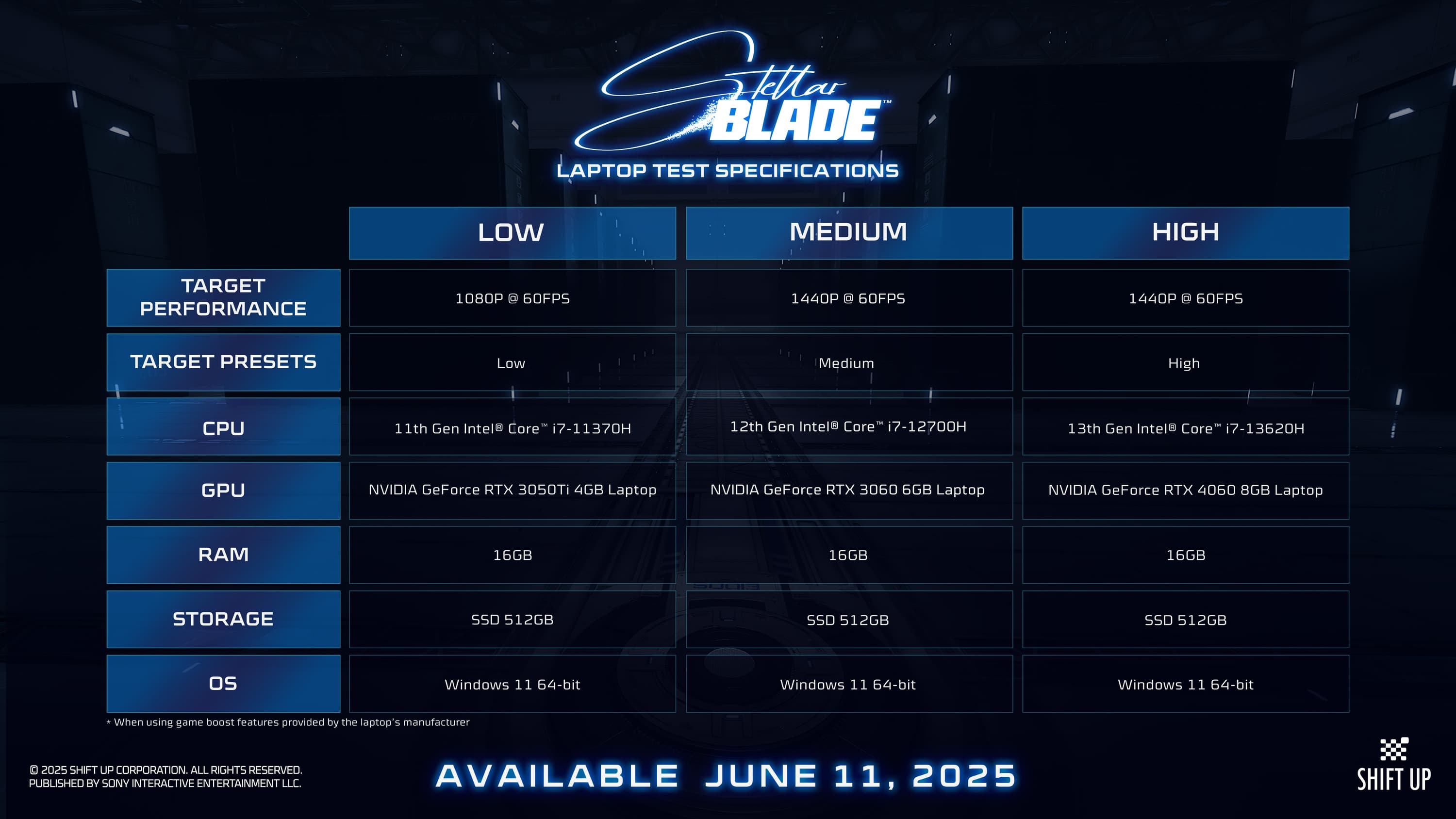 Теперь Shift Up раскрыла системные требования Stellar Blade для ноутбуков. Поиграть на низких настройках графики в 60 FPS при 1080p можно будет с видеокартой уровня NVIDIA GeForce RTX 3050 Ti 4GB Laptop.