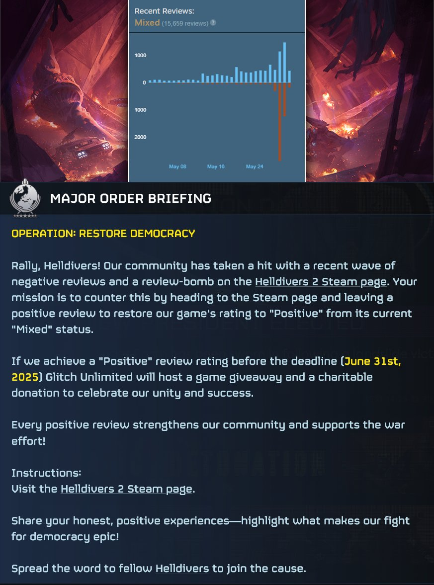 «Глобальный приказ Glitch Unlimited: Давайте восстановим рейтинг игры до его исходного состояния до того, как он был изменен на "Смешанный". Я проведу розыгрыш игр и пожертвую на благотворительность, если мы сможем это сделать».