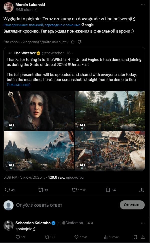 Много сомнений вызвало то, как проработан мир и персонажи. Пользователи соцсетей и блогеры предполагают, что на релизе игра потеряет в качестве — как это уже бывало с другими проектами. Среди них — Марцин Луканский, чьё сообщение привлекло внимание геймдиректора Себастьяна Калембы. Он написал короткое «спокойно» со смайликом.
