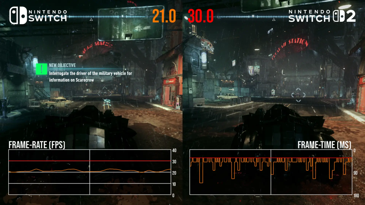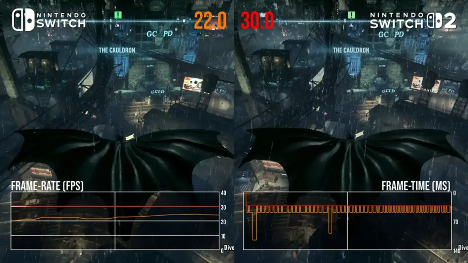 Среди таких игроков оказался и специалист Digital Foundry Ричард Лидбеттер — он провёл тесты и выяснил, что Batman Arkham Knight на Switch 2 работает в стабильных 30 FPS даже в требовательных сценах.