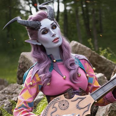 У этой молодой девушки с тёмно-сиреневыми и длинными вьющимися волосами, светло-сливовой кожей, оранжевыми глазами и рогами, обожающей играть на лютне, мягкий и добрый характер.