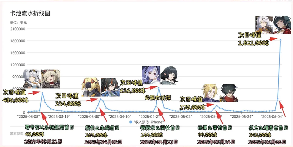 На графике представлены доходы Zenless Zone Zero на iOS в Китае для разных баннеров: