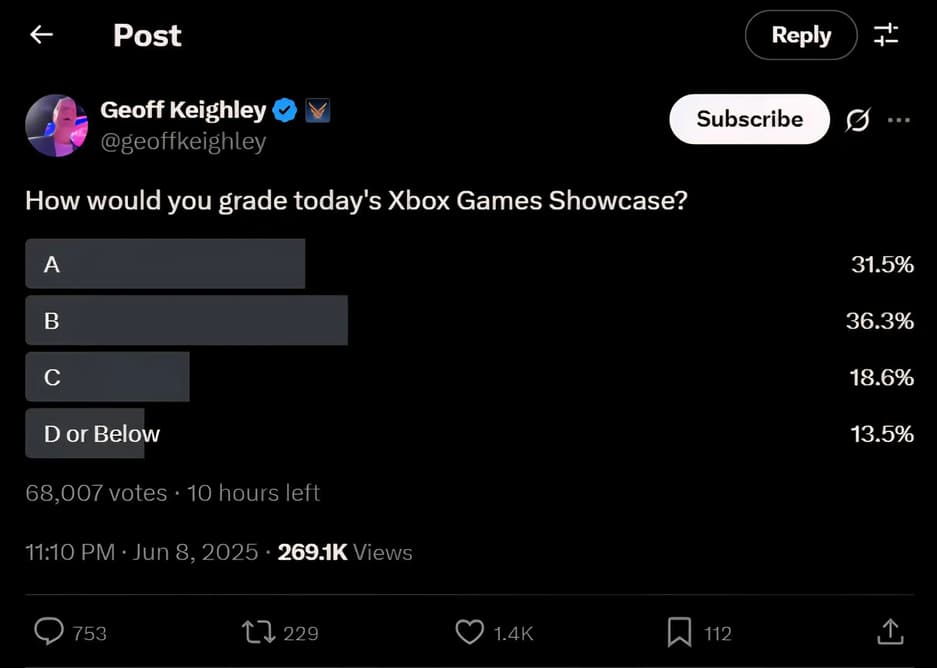Xbox Games Showcase 2025 стало главным событием Summer Game Fest, по мнению игроков. В опросе Джеффа Кили в сети X около 70% пользователей поставили шоу оценку A или B, назвав его лучшим среди всех презентаций фестиваля.