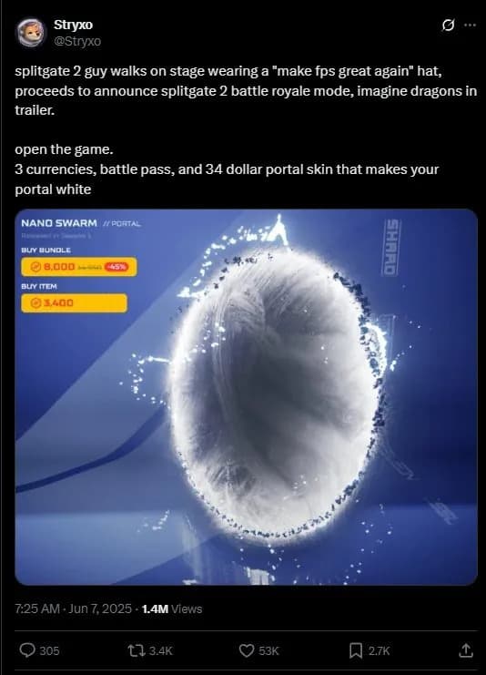 На фоне общего недовольства в индустрии, от незавершённых релизов до навязчивых микротранзакций, неудачная шутка в адрес Call of Duty только усилила негатив вокруг Splitgate 2.