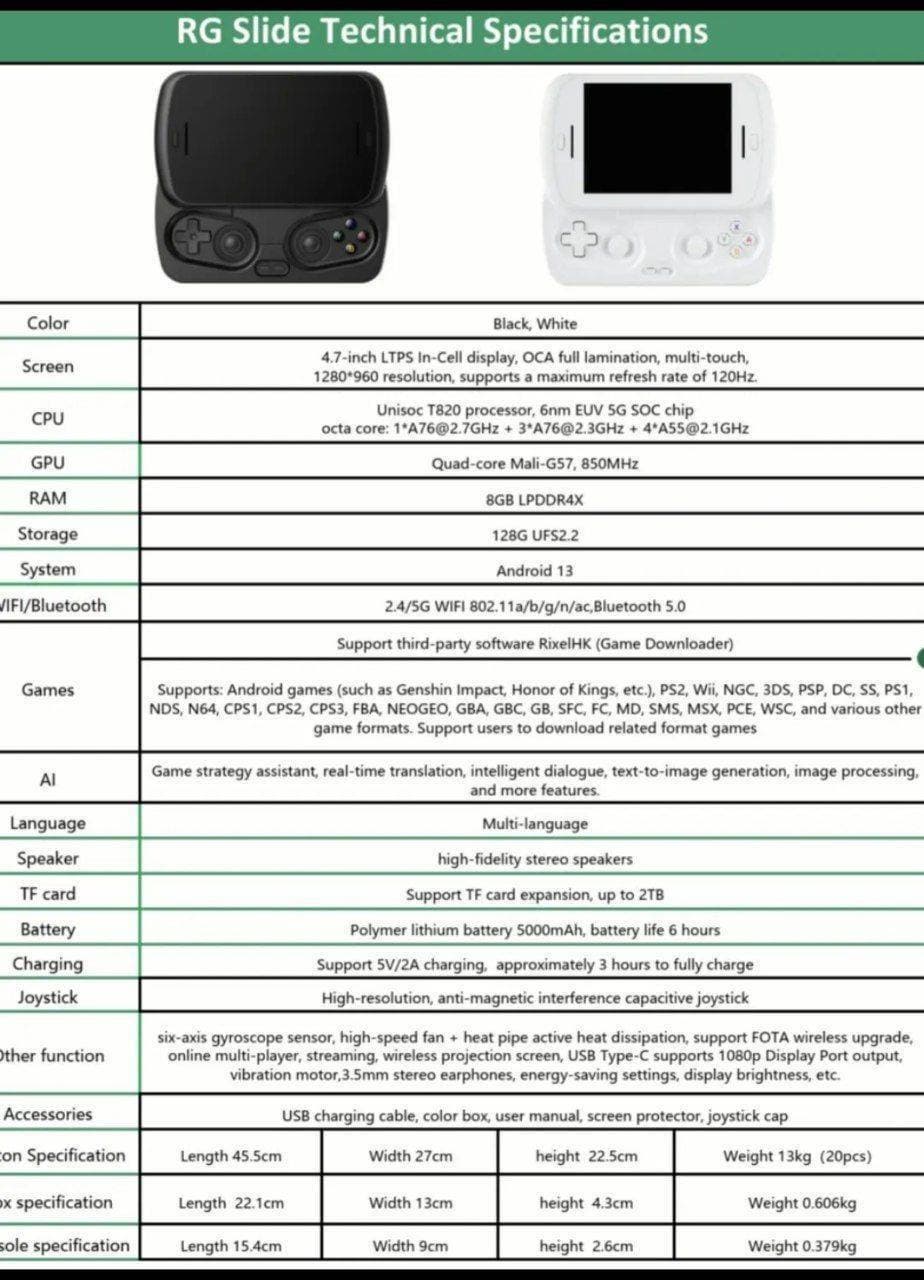 В сеть утекла картинка, на которой представлены характеристики портативной консоли в формате слайдера Anbernic RG Slide (полученную информация пока все-таки стоит воспринимать в виде слуха).