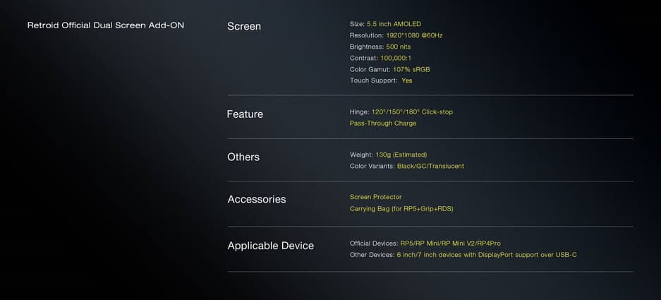 Компания Retroid опубликовала характеристики дополнительного экрана с креплением для Retroid Pocket 5, Pocket Mini и Pocket 4 Pro (теоретически он может работать и с другими портативными консолями, но там все зависит от крепления).