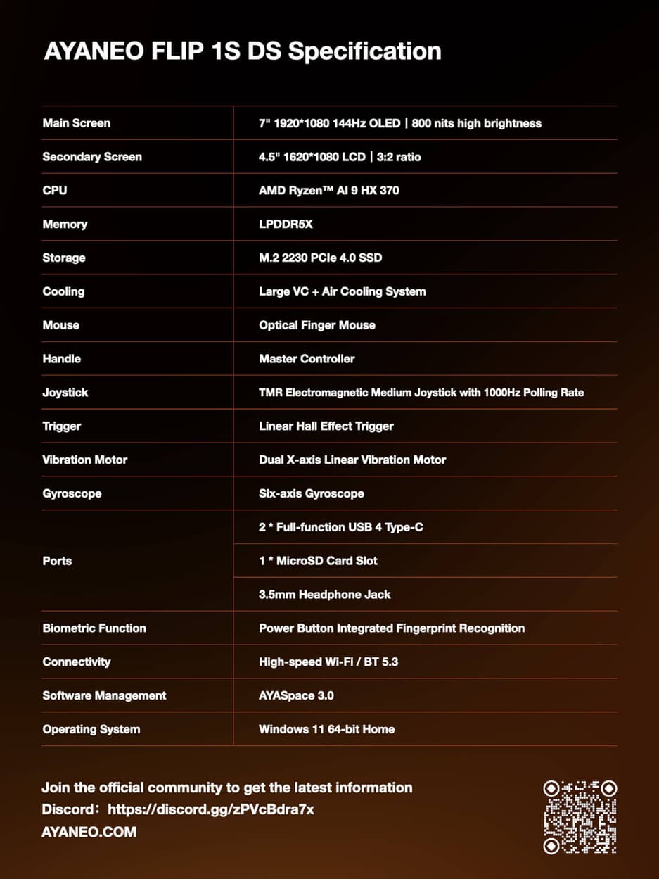 Ayaneo Flip 1S DS получит процессор AMD Ryzen AI 9 HX 370, оперативную память LPDDR5X, встроенную память M.2 2230 PCIe 4.0 SSD, оптическую мышь (для пальца), триггеры с эффектом Холла, электромагнитный джойстик TMR Medium с частотой опроса 1000 Гц.