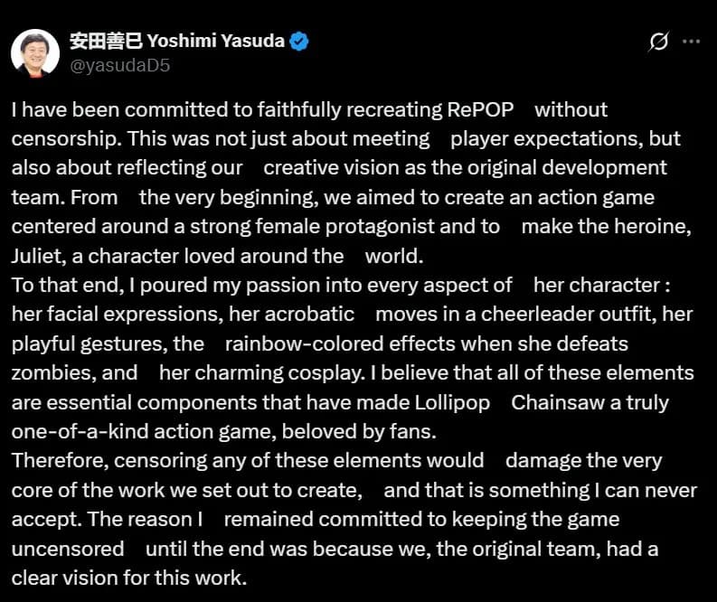 Цензура в игровой индустрии вызывает всё больше споров. Многие разработчики и фанаты выступают против изменений в оригинальных версиях игр. Среди них — Ёсими Ясуда, геймдизайнер Lollipop Chainsaw.