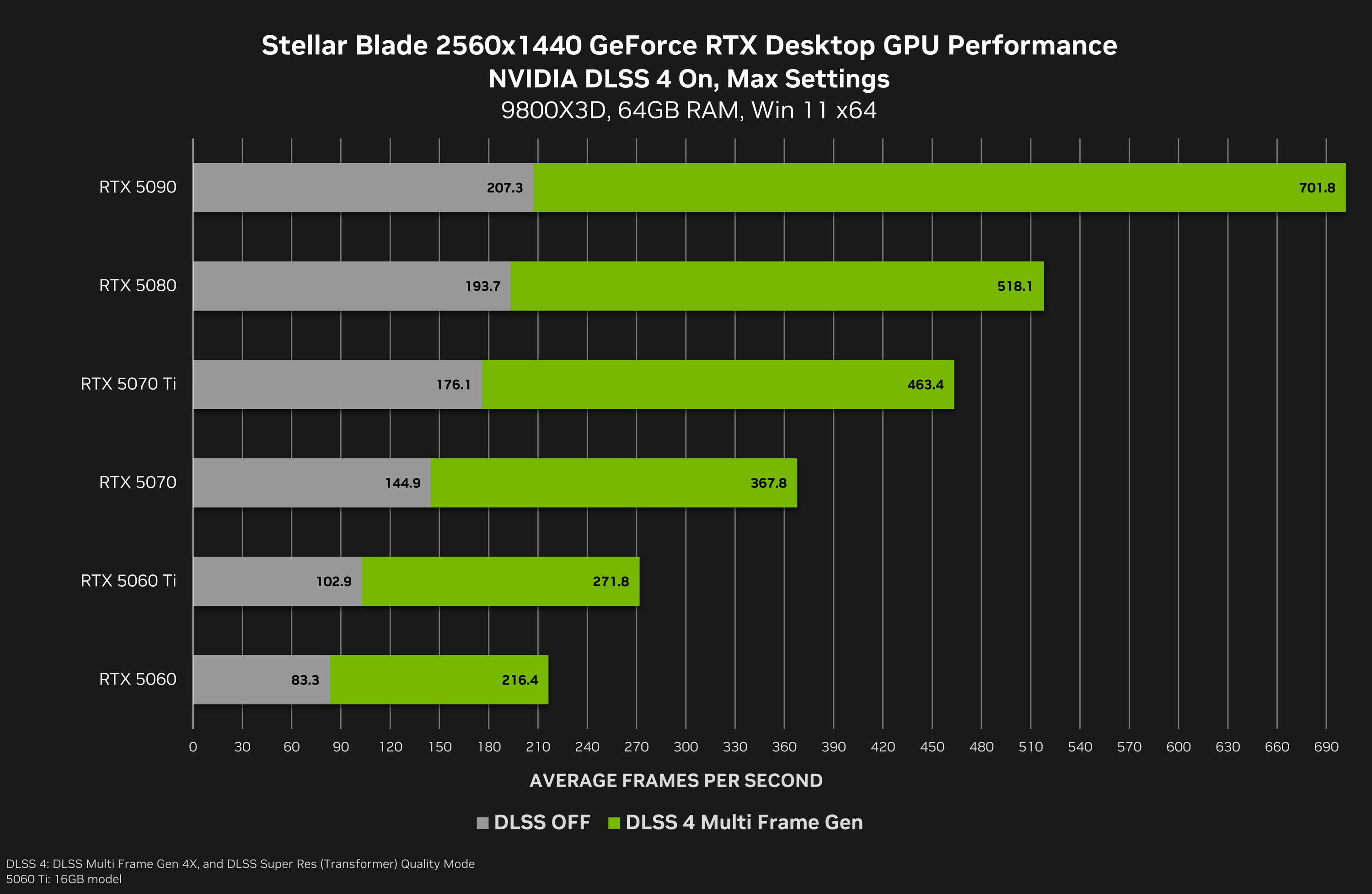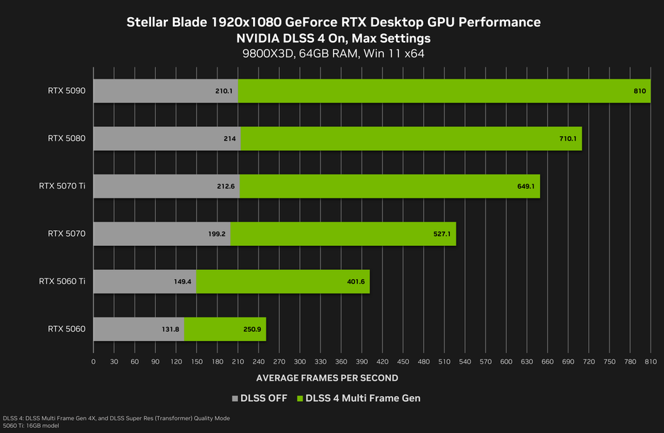 Компания провела серию тестов Stellar Blade и показала, что при определённых настройках графики в 1080p на RTX 5090 можно разогнать частоту кадров до показателя в 800+ FPS.