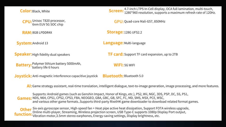 В данном устройстве можно отыскать центральный процессор Unisoc T820, графический процессор Mali-G57 (850Mhz), оперативную память LPDDR4X 8 GB, операционную систему Android 13, 5G WIFI, 128 GB встроенной памяти, Bluetooth 5.0, литий-полимерный аккумулятор на 5000 мАч (время работы – 6 часов).