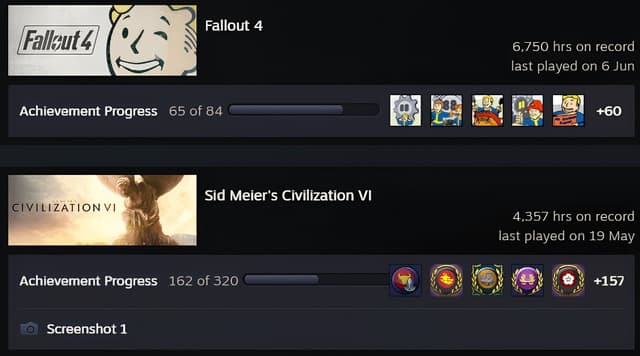 Скриншот из аккаунта показывает: 6750 часов в Fallout 4 и 4357 — в Civilization VI. Это более 462 дней игрового времени.