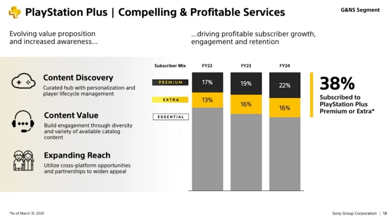 [...] PlayStation Plus высоко ценится нашими игроками и продолжает стимулировать вовлеченность. Мы уже увидели тенденцию к выбору более высоких уровней в рамках нашего сервиса, о чём свидетельствует состав подписчиков, которого мы достигли в 2024 финансовом году — около 38% игроков подписаны на уровни PlayStation Plus Premium или Extra».