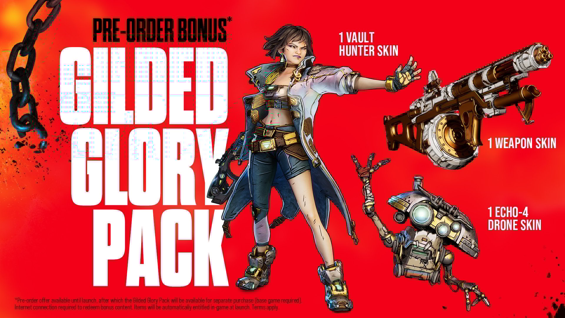 Все, кто оформит предзаказ на любую версию игры, получат Gilded Glory Pack, включающий скин для Vault Hunter, скин для оружия и скин для дрона ECHO-4.