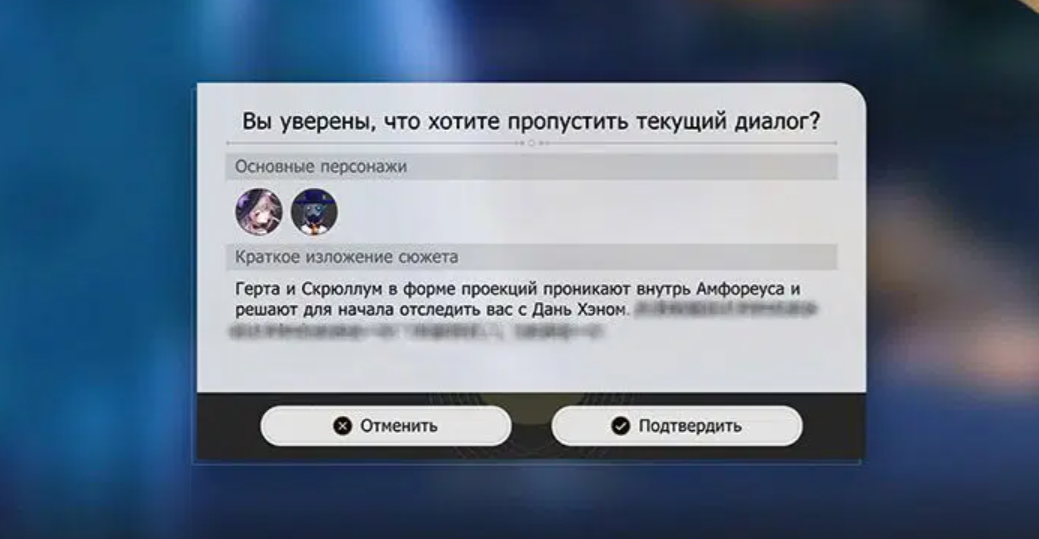 В HSR 3.4 появится пропуск диалогов и краткое изложение сюжета, а в обновление 3.6 добавят просмотр предыдущего сюжета.