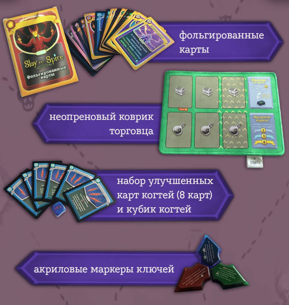 В коллекционке пользователи обнаружат четыре неопреновых мата для игроков, неопреновый мат для организации колод, где хранятся монстры и прочие карты для забега, набор металлических монет с мешочком, дополнительный органайзер для хранения вышеперечисленного и большую коробку.