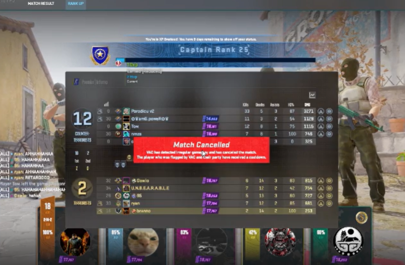 Valve настроила систему так, что античит VAC способен заблокировать читера прямо во время матча, а результаты игры в таком случае отменяются — это и случилось с целью многочисленных репортов Annual_Special1387.