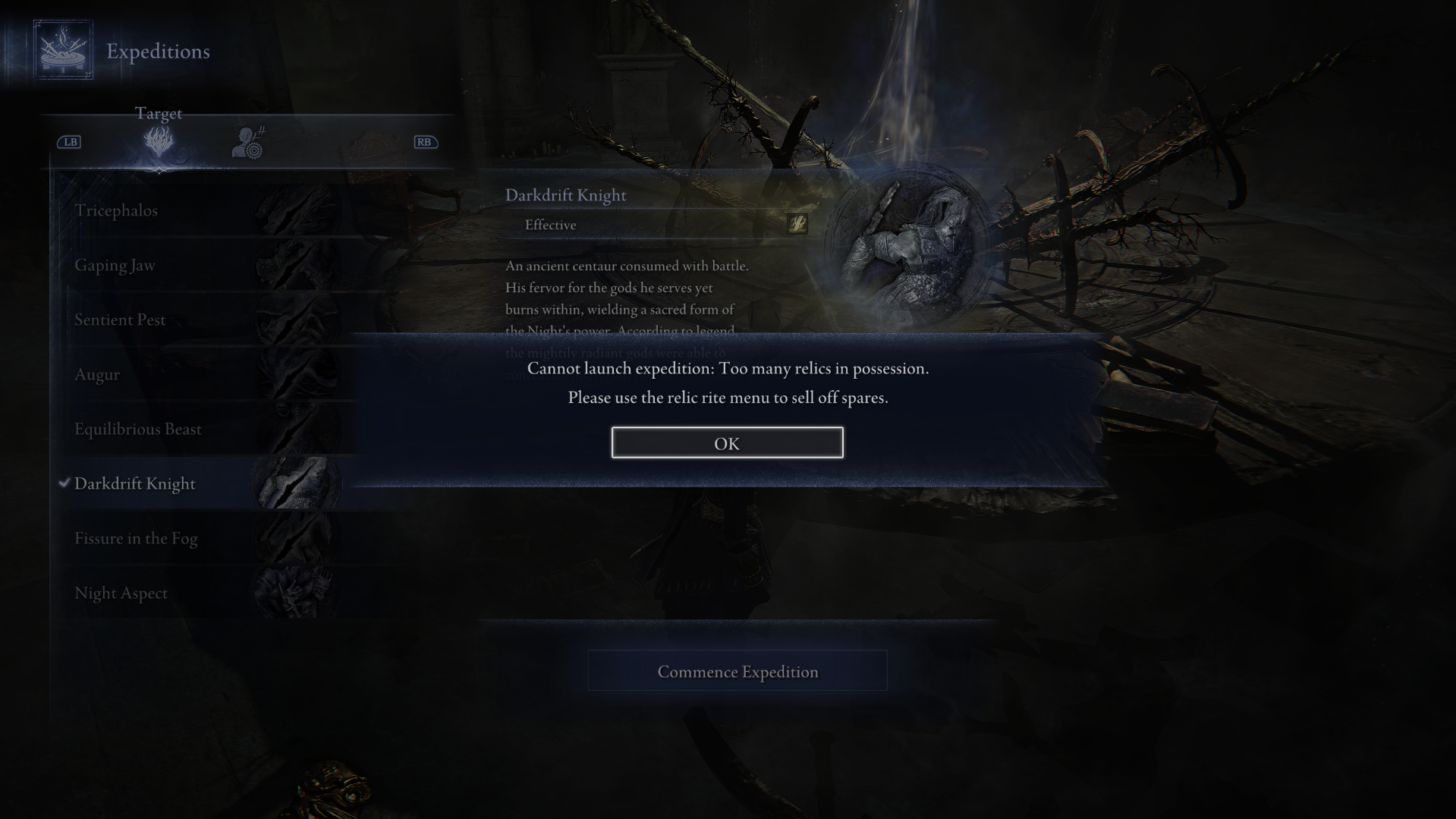 Игроки Elden Ring Nightreign, кооперативного рогалика от FromSoftware, обнаружили скрытый лимит инвентаря реликвий, который не позволяет начать новые экспедиции после его достижения. Пользователь Reddit под ником Scufozzover1 опубликовал скриншот игрового сообщения: «Невозможно начать экспедицию: слишком много реликвий в инвентаре», с рекомендацией продать лишние реликвии через меню ритуала реликвий.