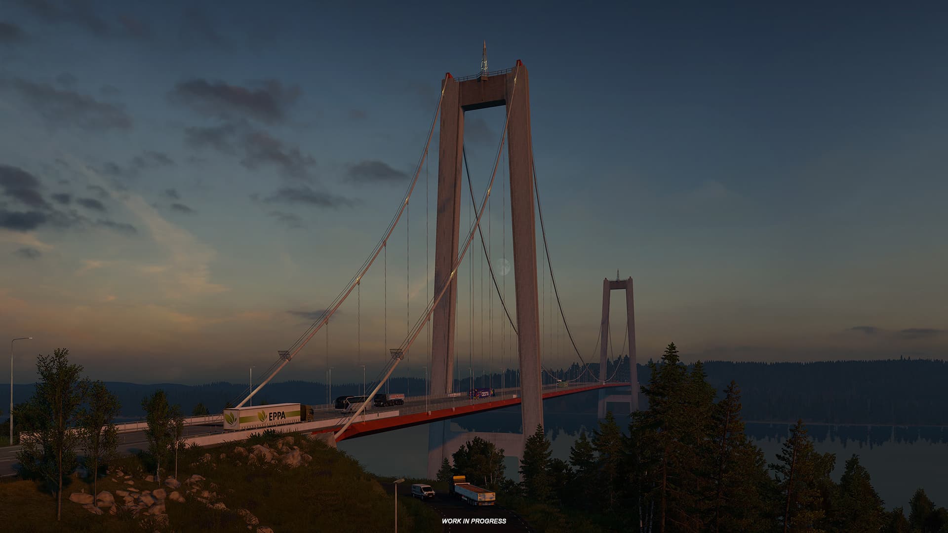 В процессе выполнения заказов игроки в Euro Truck Simulator 2 смогут оценить воссозданный мост Хёгакустенброн — один из самых длинных подвесных мостов Швеции.