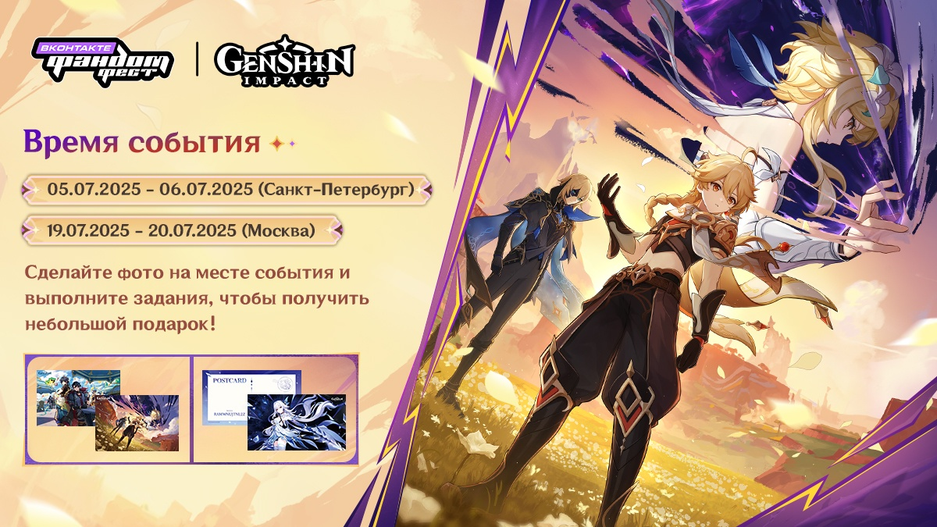 «Мы будем рады видеть вас на VK Fest в этом году! Приглашаем принять участие в активностях, которые мы подготовили для вас в коллаборации Фандом Феста ВКонтакте × Genshin Impact. Отметьтесь у фотоcтены Genshin Impact и получите шанс выиграть небольшой подарок!»