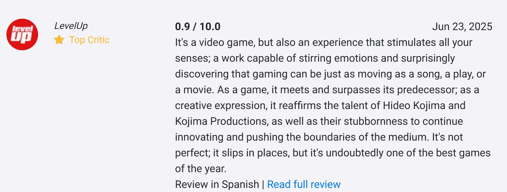 Испанское издание Level Up поставило Death Stranding 2: On the Beach 0,9 баллов вместо 9 баллов из 10, что повлияло на общий рейтинг нового проекта Kojima Productions на агрегаторе OpenCritic. Ошибку оперативно исправили, после чего общий рейтинг игры поднялся с 88 до 92 баллов (сейчас он опустился до 91 балла).