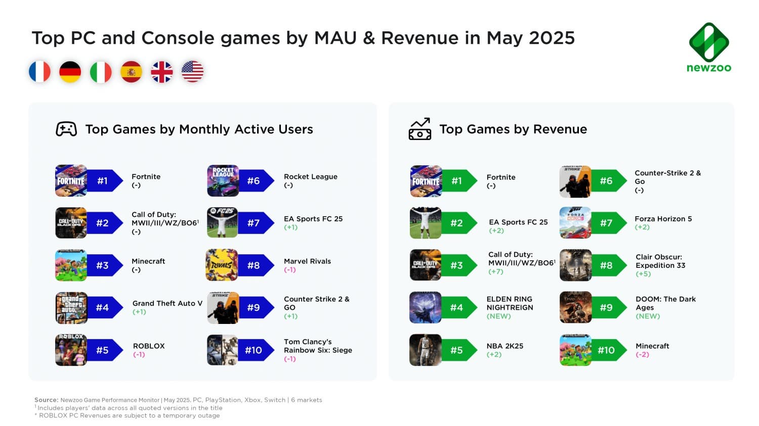 По данным Newzoo, выручка от продаж на ПК заметно превосходит доходы с других платформ. В топ-5 игр мая оказались: на первом месте Fortnite, за ним EA Sports FC 25, Call of Duty, затем Nightreign и на пятом месте NBA 2K25.